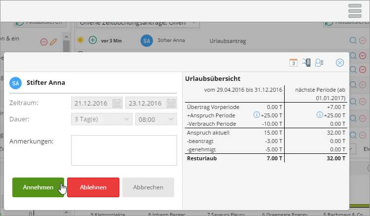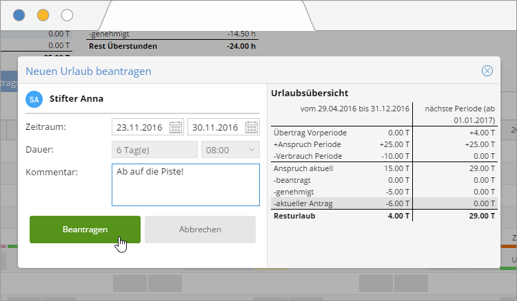 Mit der Ferienverwaltung können Mitarbeiter ganz einfach Anträge für Ferien, Zeitausgleich oder sonstige Abwesenheiten stellen. Über den integrierten Workflow ist sichergestellt, dass der zuständige Vorgesetzte die Anträge sofort erhält und auf Basis aktueller Daten zu Ansprüchen und Ressourcenverfügbarkeit bearbeiten kann.