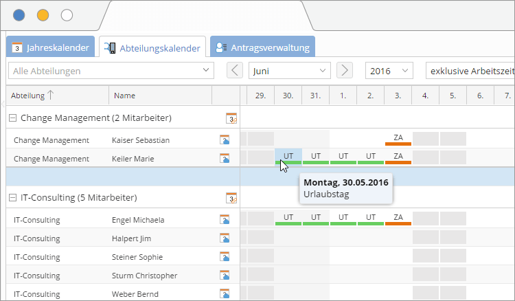 Die Monatsübersicht für Teams und Abteilungen ist eine perfekte Möglichkeit, Kapazitätsengpässe rechtzeitig zu erkennen und eine sinnvolle Planung von Ressourcen zu gewährleisten. Zusätzlich können die Abwesenheitskalender im iCal-Format exportiert oder auch als Online-Kalender abonniert werden.